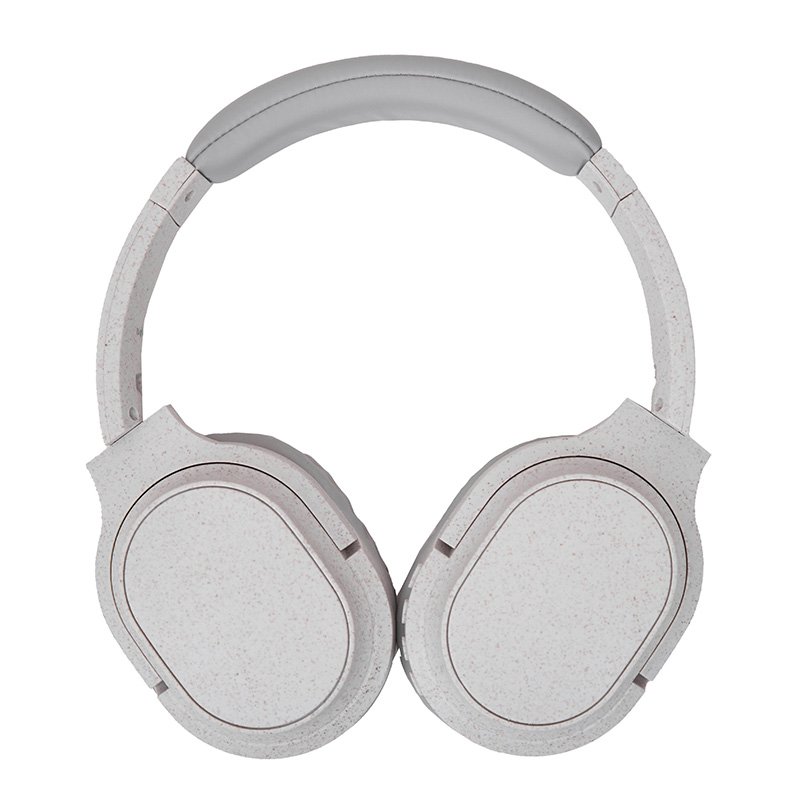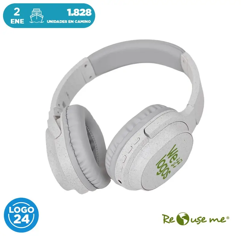 Auriculares inalámbricos estilo diadema, con micrófono incorporado. Realizado en ABS y Wheat Straw, pasta de tallo de trigo, un material sustentable que reduce el consumo de plásticos vírgenes. Cuenta con cobertura bluetooth en una distancia de 10 metros y conector para cable jack de 3.5mm, y ranura para tarjetas de memoria. Incluye cable micro USB de carga. Incluye botones de comando para encender, apagar, retroceder y avanzar. Su capacidad de carga es de 450mAh. Medidas: 195 x 165 x 75 mm. Tiene una potencia de 15mWx2 y una sensibilidad de 85dB. Impedancia: 32 Ω. Bluetooth: 5.1.