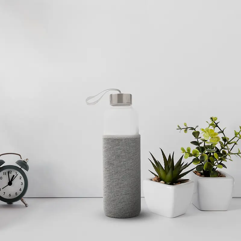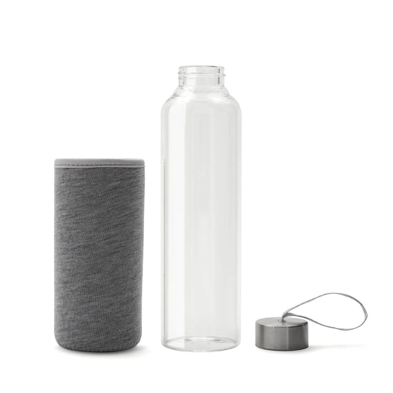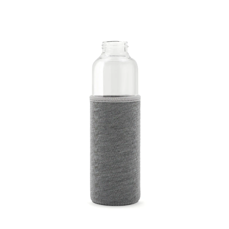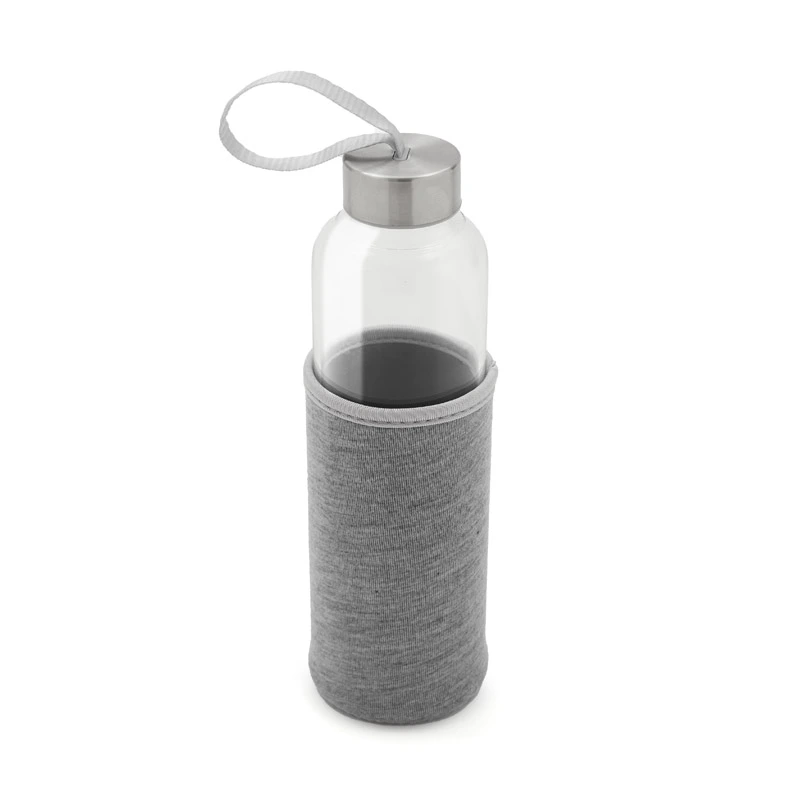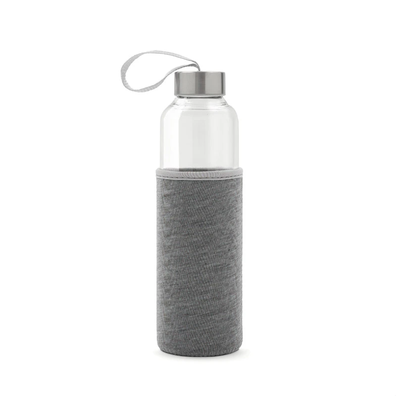 Botella fabricada en vidrio borosilicato, un material resistente y duradero. Cuenta con una funda protectora de neopreno brindando un diseño práctico que protege contra golpes. Su tapa a rosca incluye una cinta integrada, ideal para un transporte cómodo y seguro.