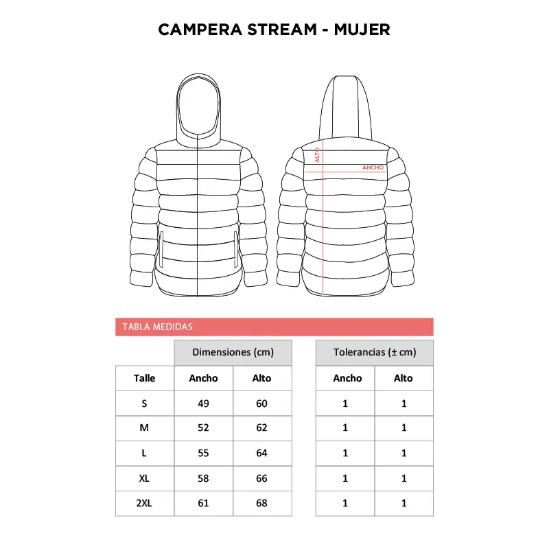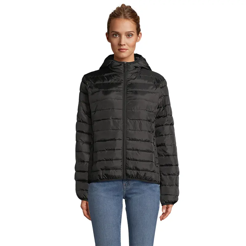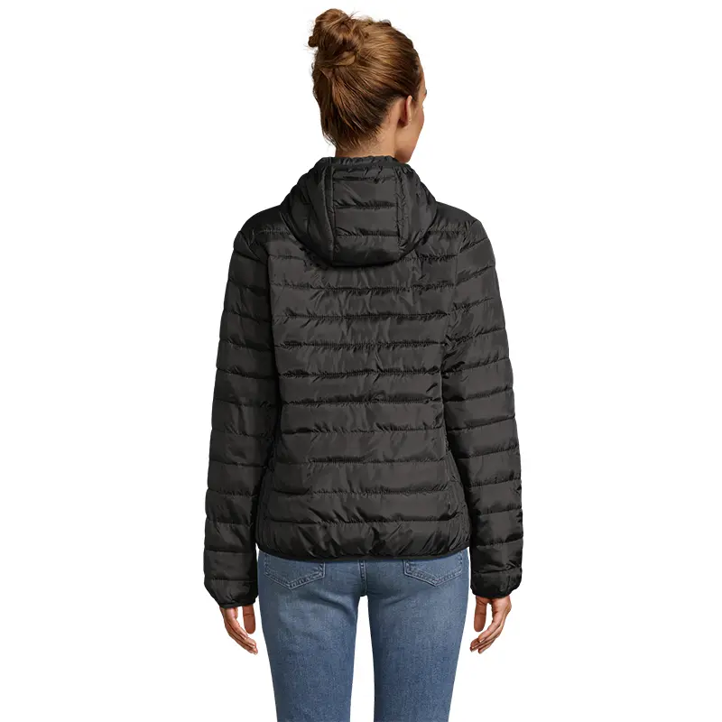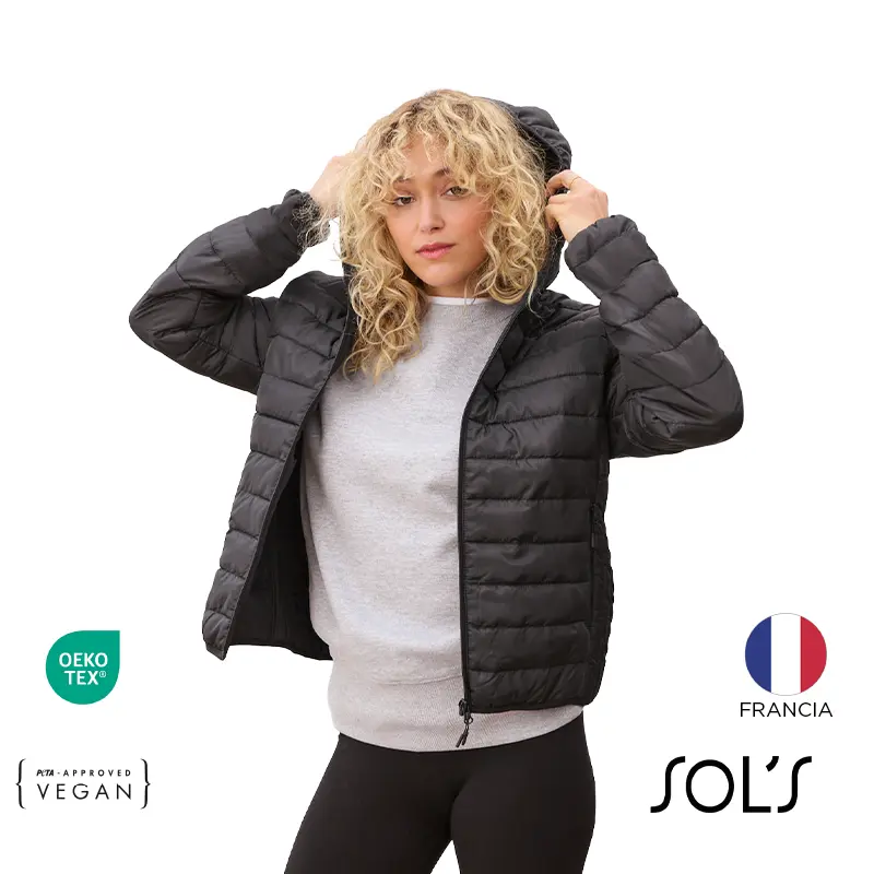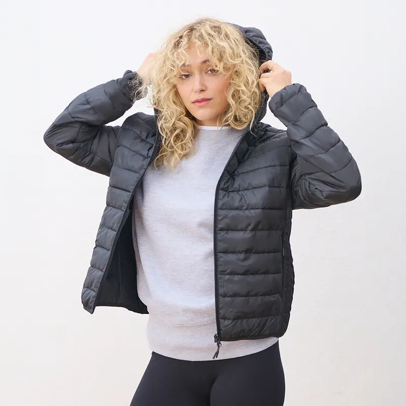 Campera ligera para mujer confeccionada en tafetán 280T. El exterior y forro están fabricados 100% en poliéster reciclado, con relleno tipo plumón 100% poliéster. Cuenta con abertura y bolsillos laterales con cierre de nylon, cursor de metal con tirador de fantasía negro, capucha con borde elástico y puños elásticos. Es ideal para uso urbano, caminatas al aire libre en climas frescos, y como abrigo liviano en invierno.