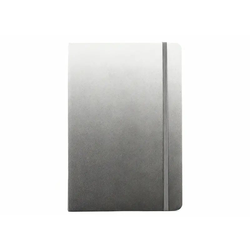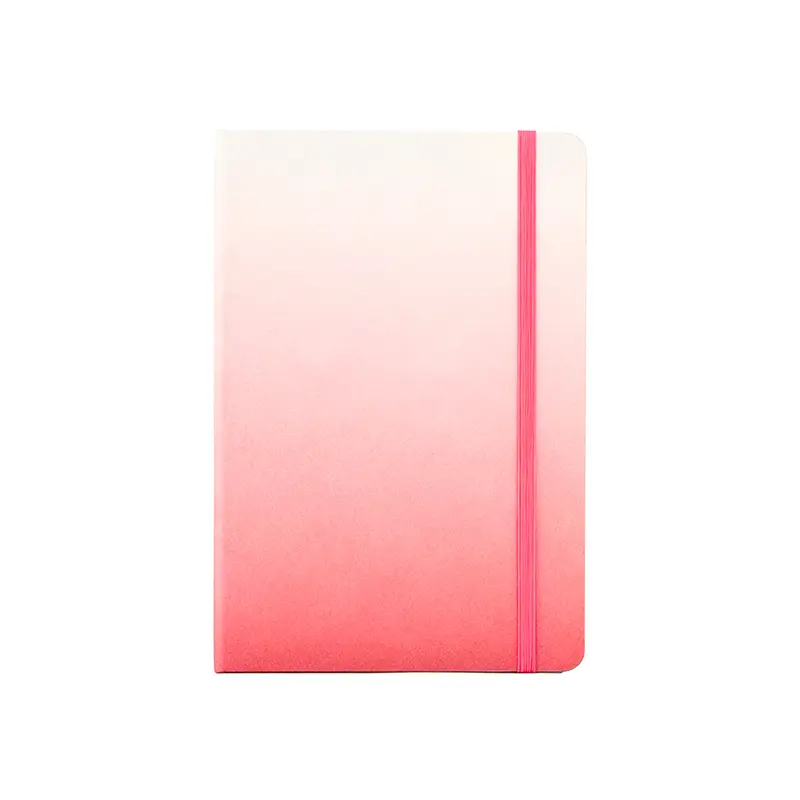 Cuaderno con tapa de efecto de color graduado. Cuenta con 80 hojas rayadas color marfil, de 70 gramos cada una. Posee una cinta separadora de color a tono y elástico para cerrarlo.