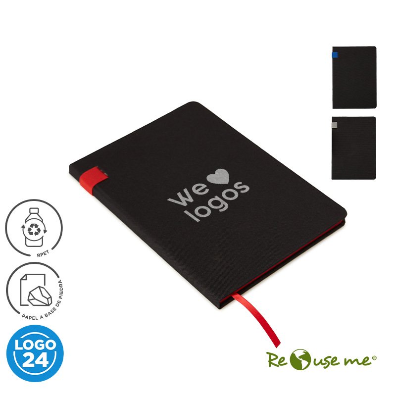 Cuaderno de tapa confeccionado con polyester RPET, hecho con botellas de plástico reciclado. Con 64 hojas lisas de Papel de 120 gramos a base de piedra, de escritura suave, más duradero y resistente que el papel tradicional. Para realizar este papel no se han talado árboles, ya que está confeccionado a partir de Polietileno y polvo de piedras. Cuenta con una cinta marcadora y borde de página de color. 64 hojas lisas de 120g. Medidas : 14,8 x 21cm. ReUseMe.