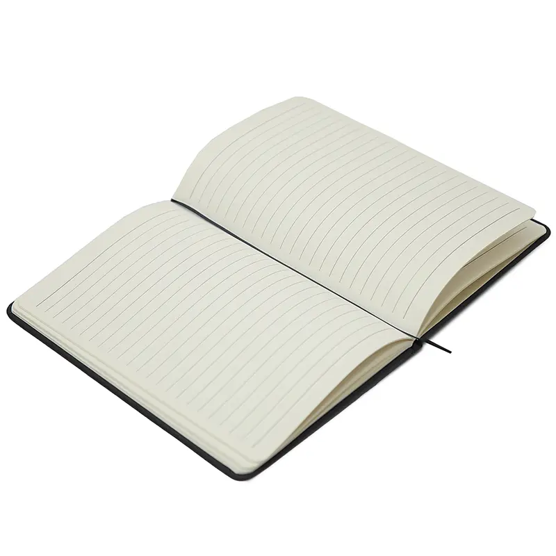 Cuaderno de tapa de dura de PU con 64 hojas rayadas. Cuenta con cierre elástico y cinta marcadora.