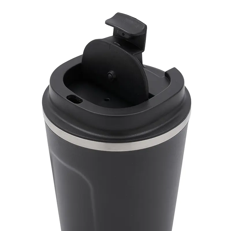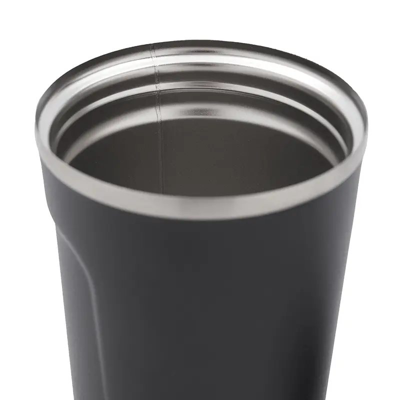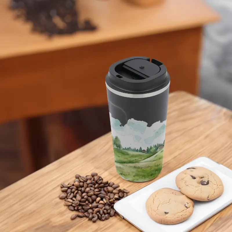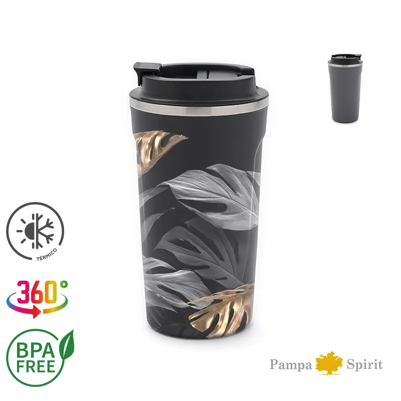 Jarro reutilizable construido en doble pared de acero inoxidable, esmaltado de color en su exterior y tapa de polipropileno antiderrame.