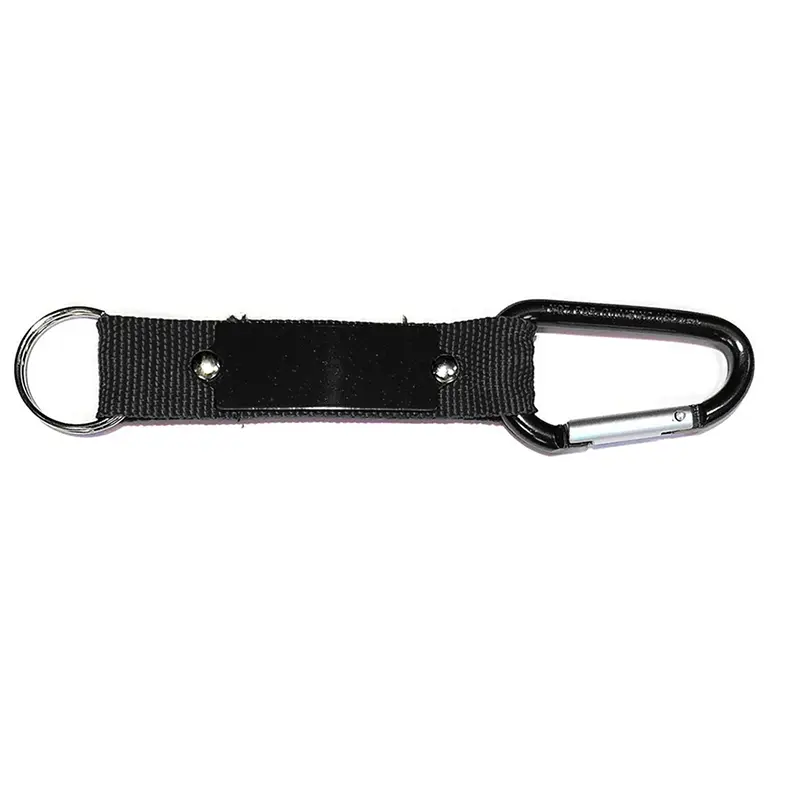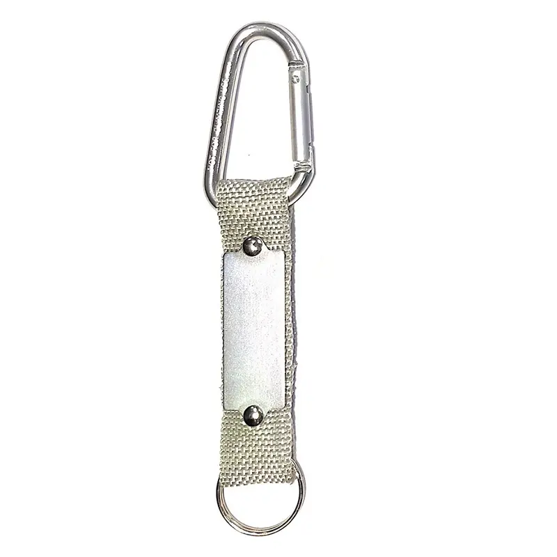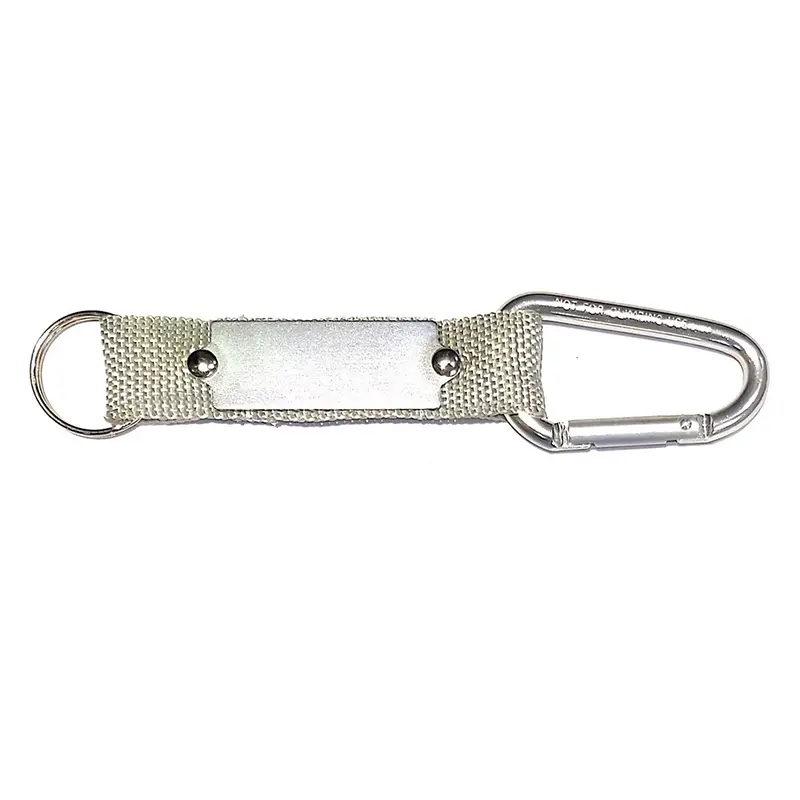 Llavero tejido de Polyester con un mosquetón de seguridad y una placa de metal para personalizar. La placa puede ser utlizada para domes o grabado láser. Medidas: 13 cm x 3,1 cm incluído el anillo (anillo de 25 mm).