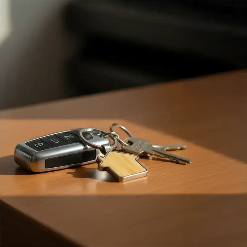Llavero metálico con silueta de casa y bambú. Fabricado en aleación de zinc y bambú en tono natural. Cuenta con anilla resistente y diseño de casa, ideal para branding. Es ideal para inmobiliarias, constructoras, promociones y obsequios corporativos.