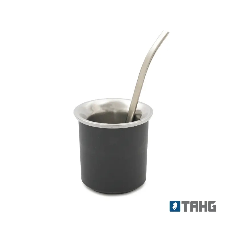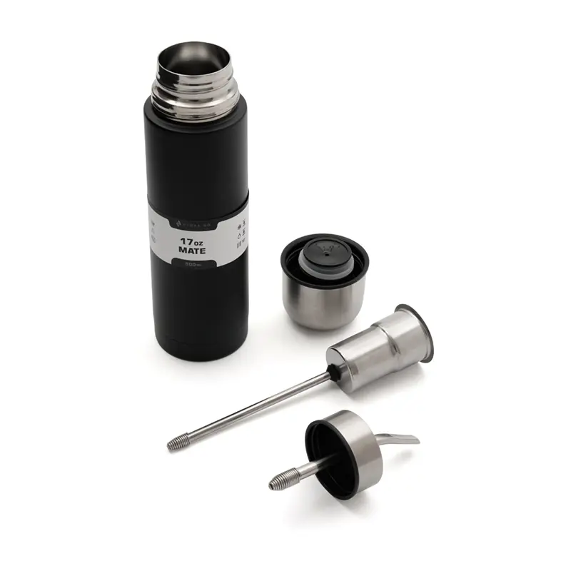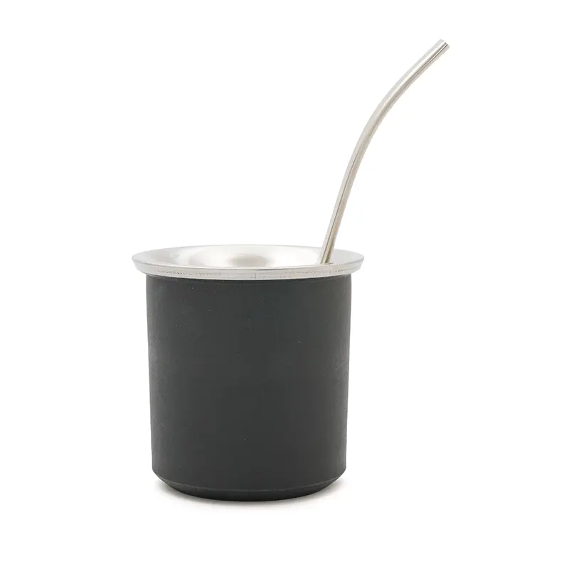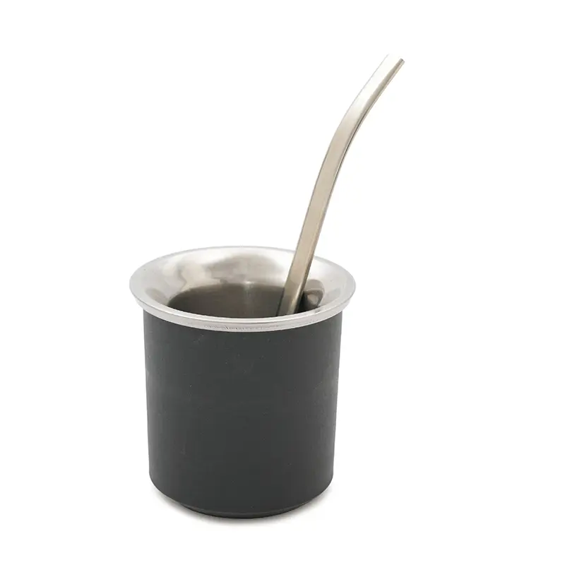 Mate práctico de acero inoxidable con doble pared térmica y exterior de polipropileno. Ideal para disfrutar de un mate cómodo y duradero en cualquier lugar. Incluye bombilla de acero inoxidable con resorte.