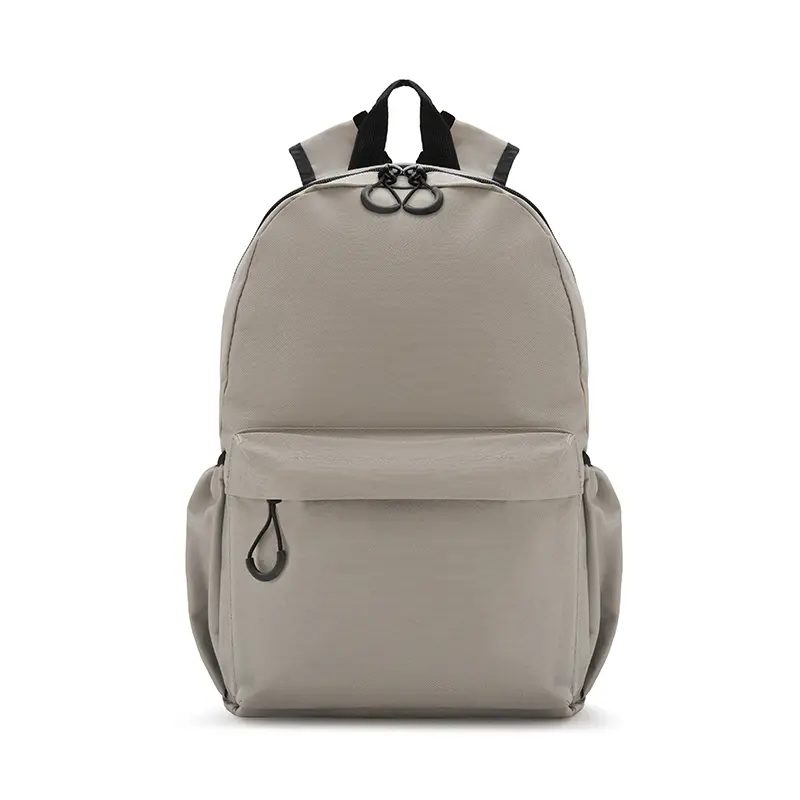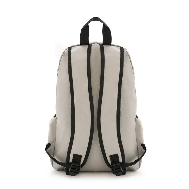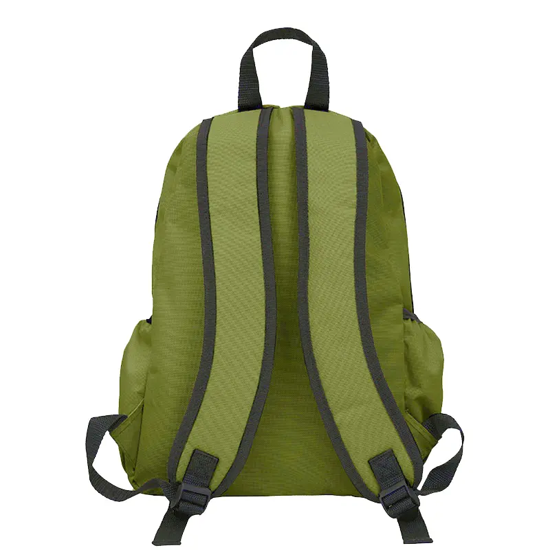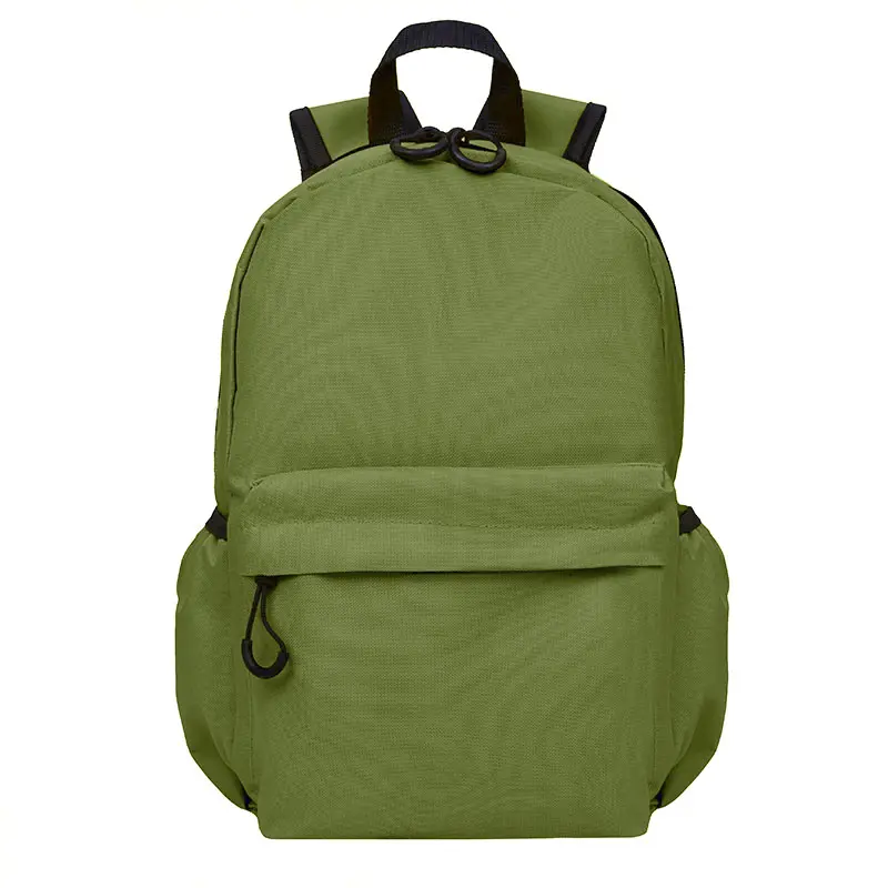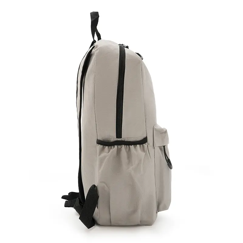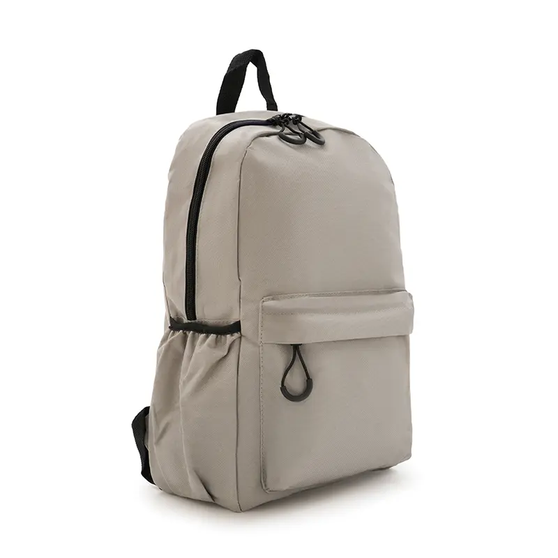 Mochila confeccionada en Polyester, con bolsillo frontal con cierre y 2 bolsillos laterales elásticos .