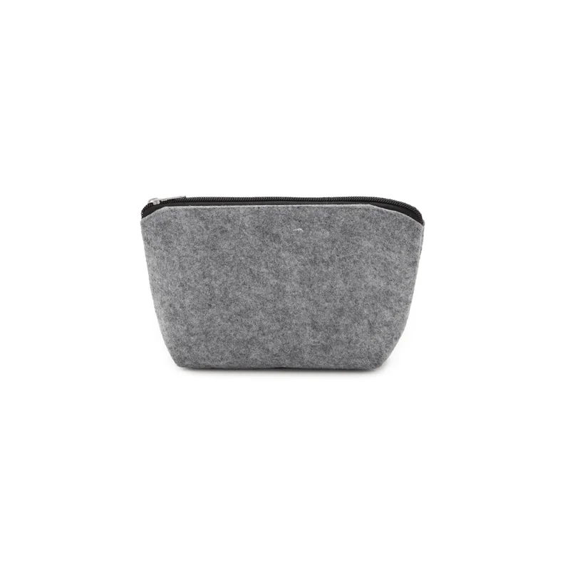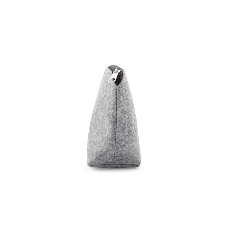 Neceser de fieltro RPET en color gris con detalles en negro, confeccionada a partir de botellas recicladas. Ideal para transportar los elementos de cuidado personal en viajes y bolsos de deporte.