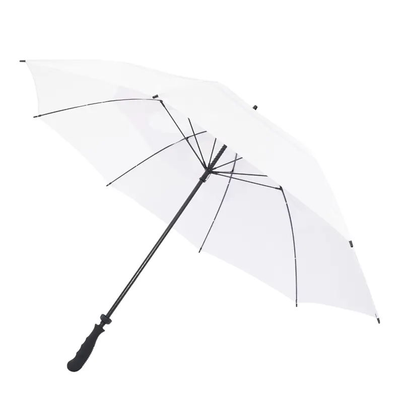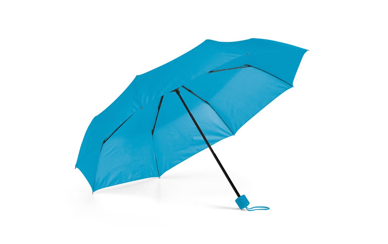 Diseño y tamaño ideal para transportar, posee correa para colgar, mango de plastico de color. Incluye funda mismo color. De 8 gajos de estructura en 3 partes metálica, botón de bloqueo, apertura manual. Poliéster 190T