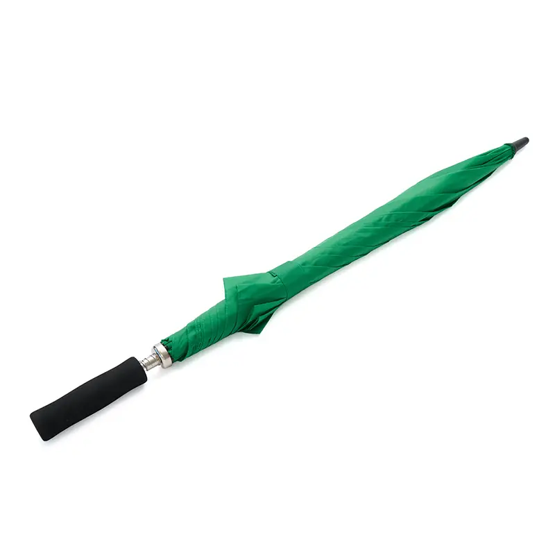 Diseño y tamaño ideal para transportar, posee correa para colgar, mango de plastico de color. Incluye funda mismo color. De 8 gajos de estructura en 3 partes metálica, botón de bloqueo, apertura manual. Poliéster 190T