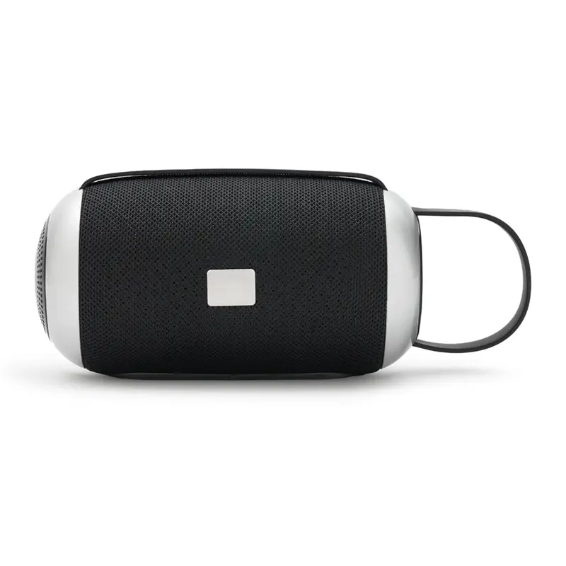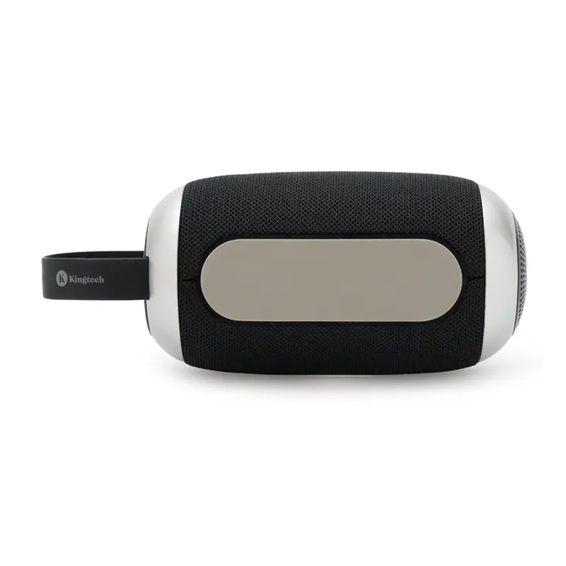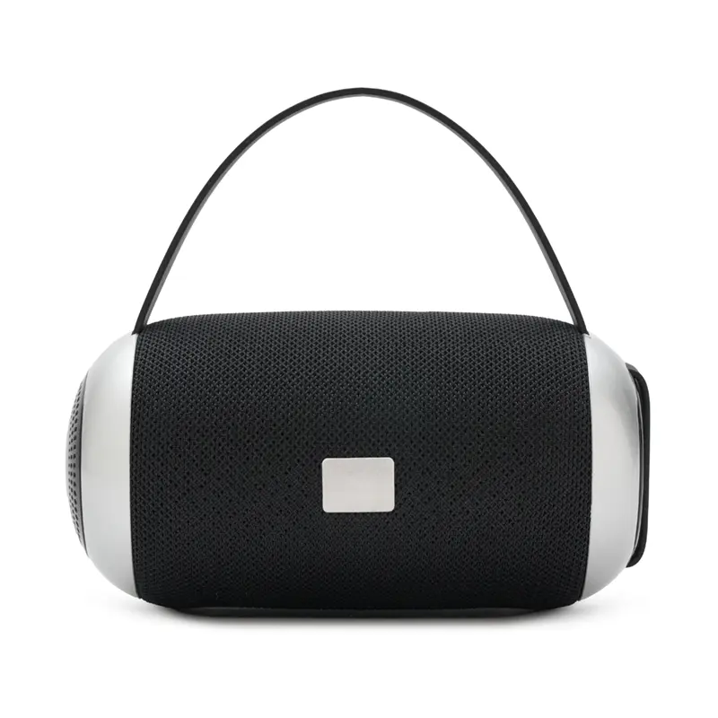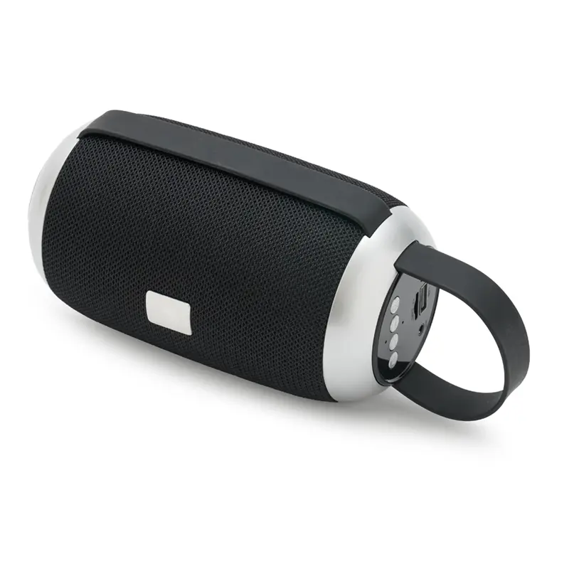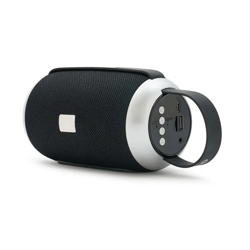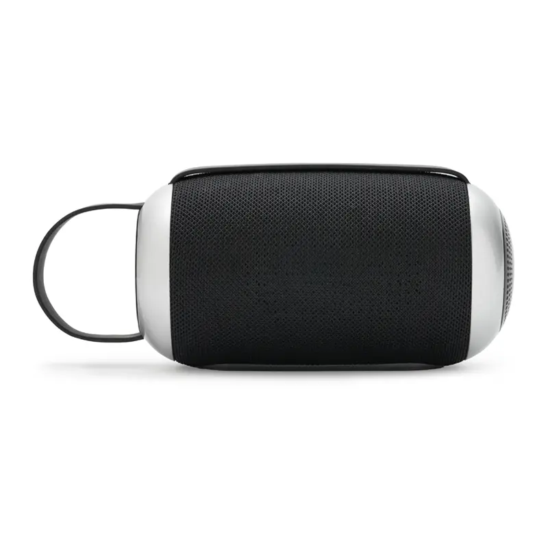 Parlante portátil Bluetooth de color negro con detalles en gris.