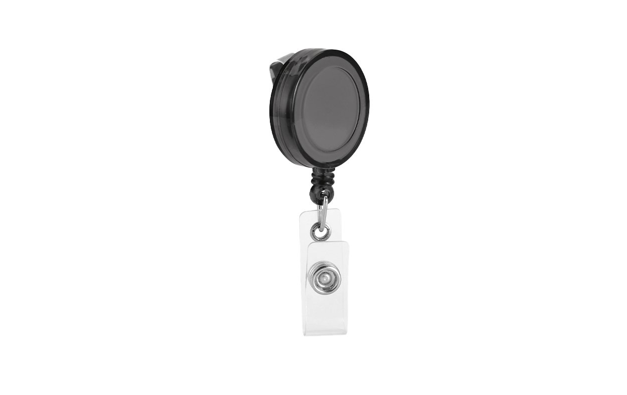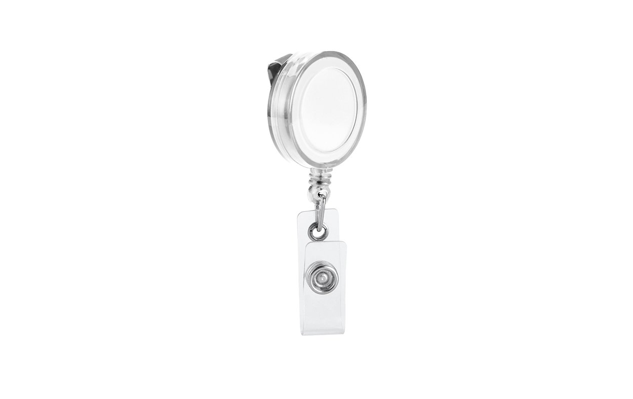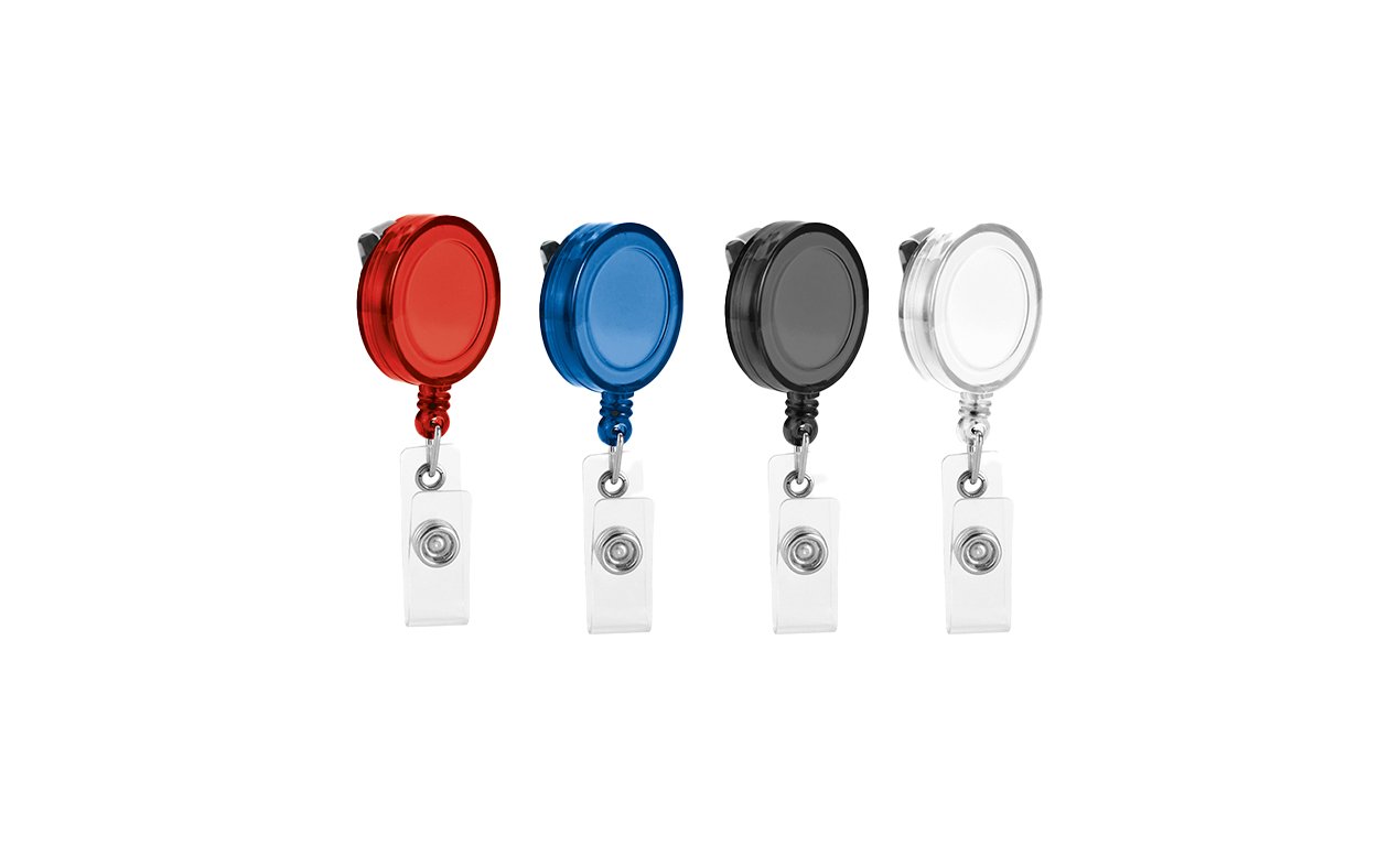 Cuerpo translúcido, con clip metálico y mecanismo extensible hasta 90 cm. El mecanismo retráctil permite presentar la tarjeta o credencial de forma segura y cómoda. Viene con clip transparente y botón para añadir tarjeta. ø32 x 9 mm